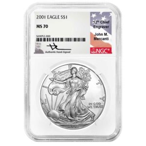2001 $1 1-oz American Silver Eagle NGC MS70 Mercanti Flag Signature Label