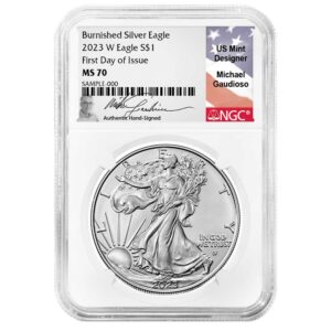 2023-W $1 1-oz Burnished American Silver Eagle NGC MS70 FDI Gaudioso Flag Signature Label