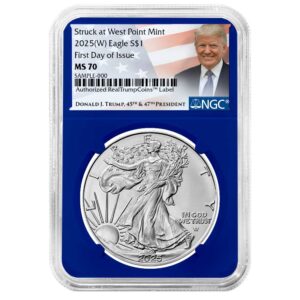 2025 $1 1-oz American Silver Eagle NGC MS70 FDI Trump Label Blue Core