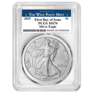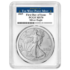 2025 $1 1-oz American Silver Eagle PCGS MS70 FDOI West Point Label Blue Frame