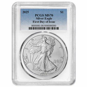 2025 $1 1-oz American Silver Eagle PCGS MS70 FDOI Blue Label White Frame
