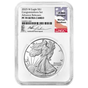 2025-W $1 1-oz Proof American Silver Eagle Congratulations Set NGC PF70UC AR Gaudioso Flag Label