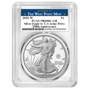 2025-W $1 1-oz Proof American Silver Eagle Army Privy PCGS PR69DCAM West Point Label 250th Anniversary