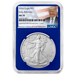 2026 $1 1-oz American Silver Eagle NGC MS70 ER Trump Label Blue Core