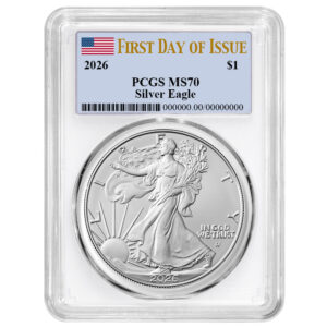 2026 $1 1-oz American Silver Eagle PCGS MS70 FDOI Flag Label White Frame
