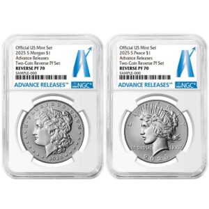 2pc Set – 2025-S Reverse Proof $1 Morgan and Peace Silver Dollar NGC PF70 AR Advance Releases Label