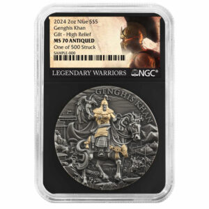 • 2024 Genghis Khan 2 oz High Relief Silver Antiqued and Gold Gilded NGC MS70 Legendary Warriors Label Retro Core
