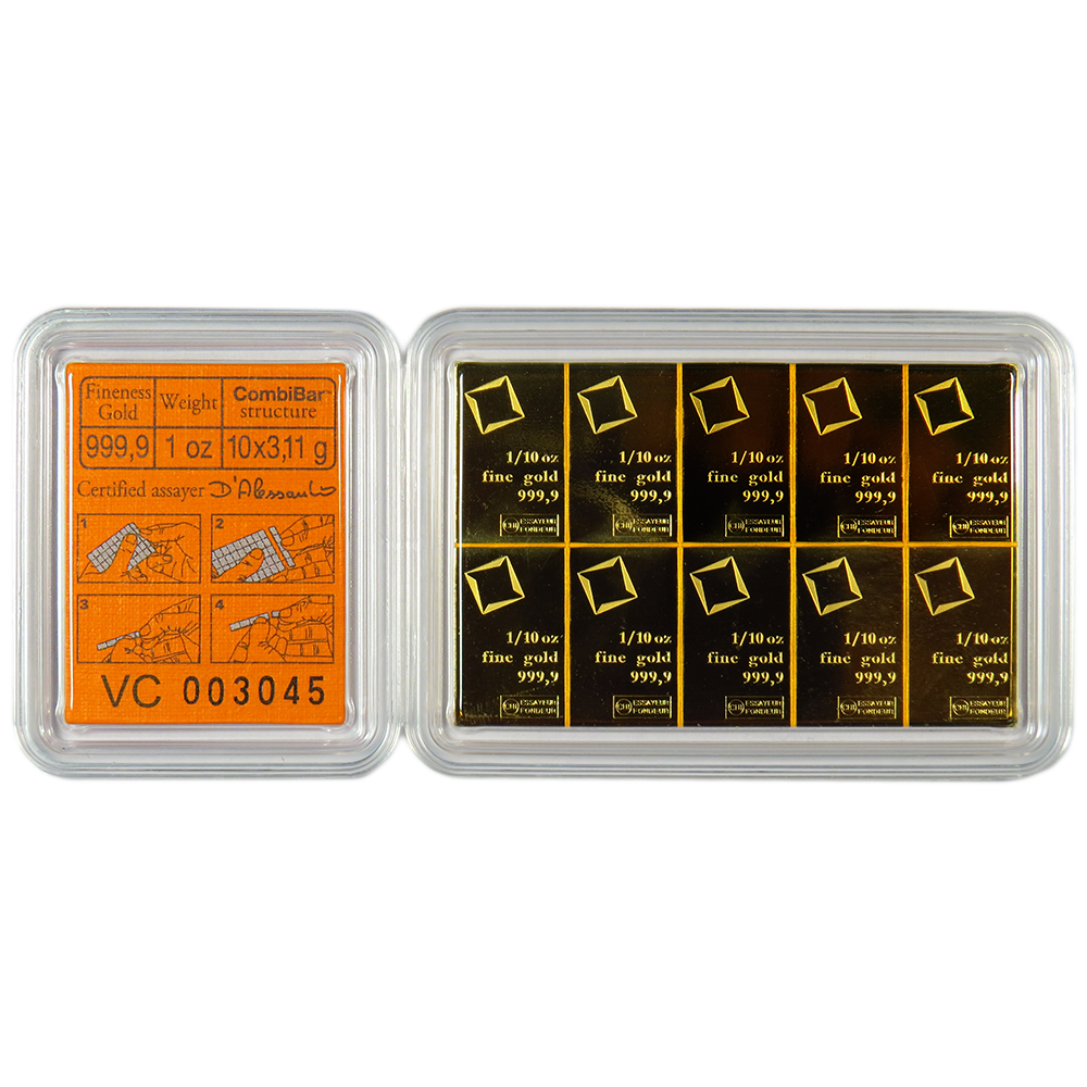 Valcambi Suisse Gold CombiBars are divisible into 1/10th oz. “Micro Bars” with no loss of metal during the separation. These bars give investors more choice in managing their physical gold holdings.