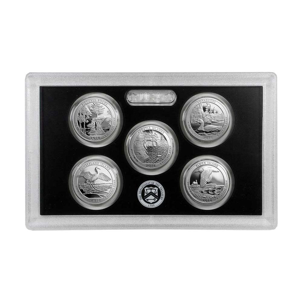 This set is comprised of a Kennedy half dollar, a Roosevelt dime, and the five America the Beautiful series quarters issued in 2018, which commemorate Pictured Rocks National Lakeshore (Michigan), Apostle Islands National Lakeshore (Wisconsin), Voyageurs National Park (Minnesota), Cumberland Island National Seashore (Georgia) and Block Island National Wildlife Refuge (Rhode Island), each struck from .900 fine silver. The remaining three coins in the set are a Jefferson nickel, a Lincoln penny and the single year of issue Native American dollar coin honoring the contributions to American sports and culture by athlete and Olympic gold medalist Jim Thorpe.