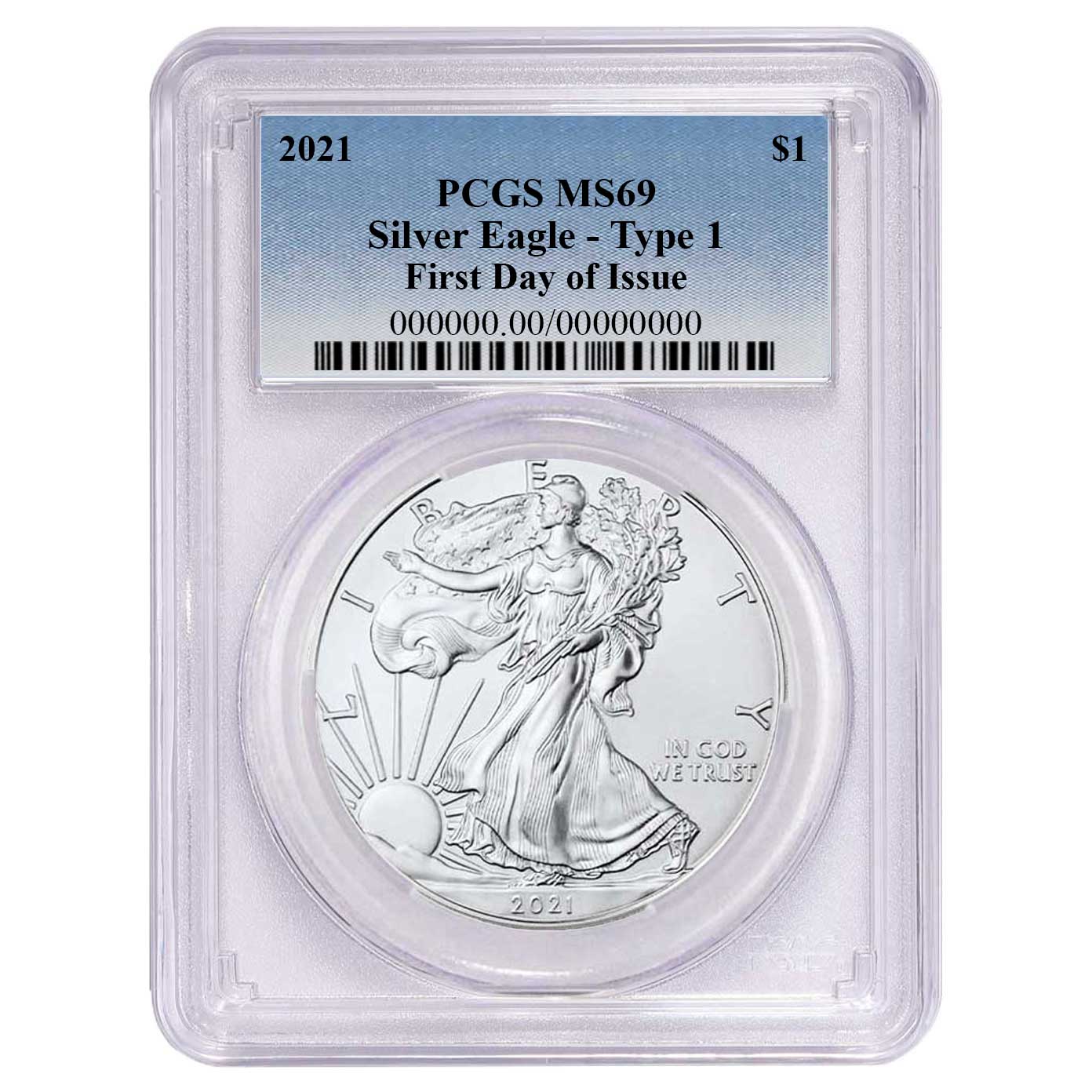 2021 $1 1-oz T-1 American Silver Eagle PCGS MS69 FDOI Blue Label