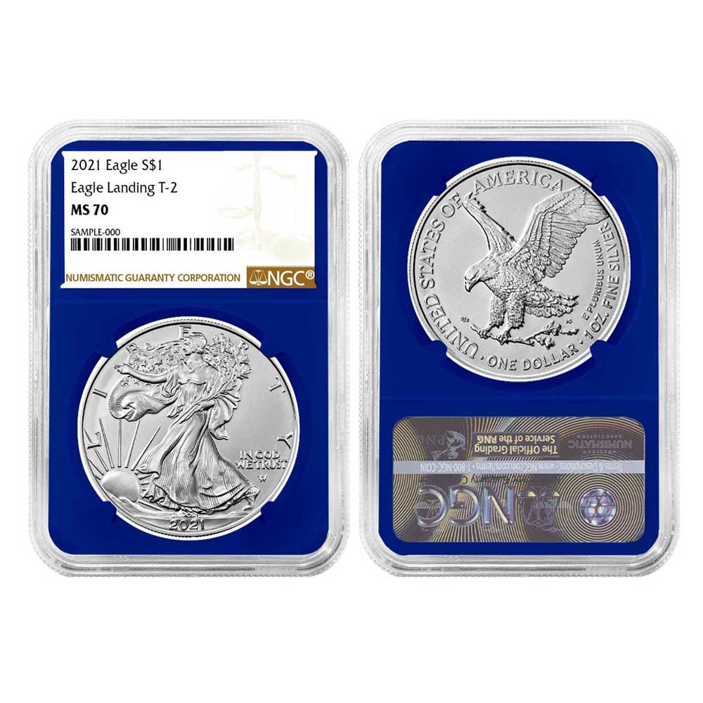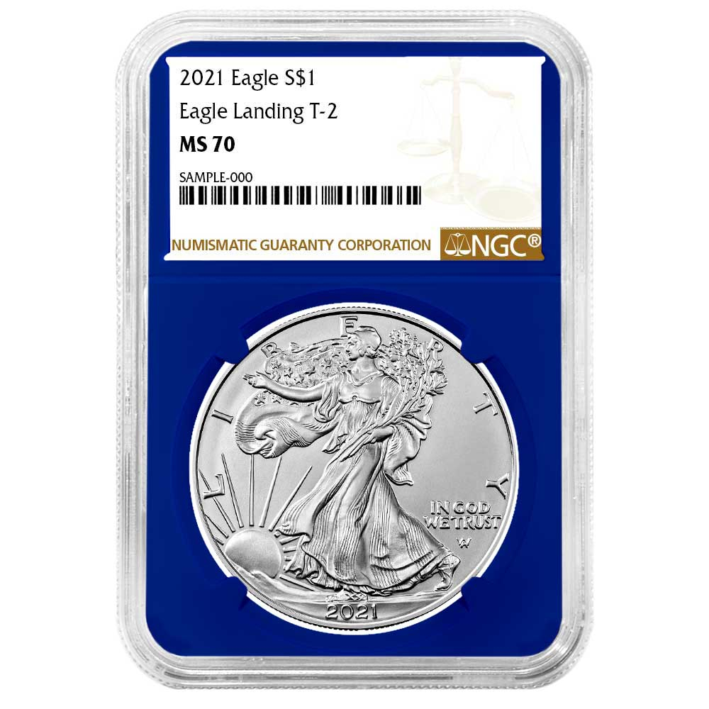 2021 $1 1-oz T-2 American Silver Eagle NGC MS70 Brown Label Blue Core