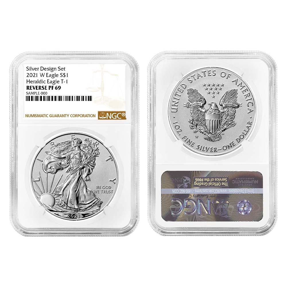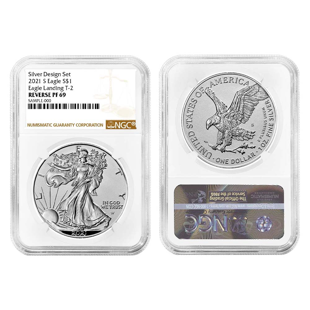 2pc Set – 2021 $1 1-oz Reverse Proof American Silver Eagle Designer NGC PF69 Brown Label