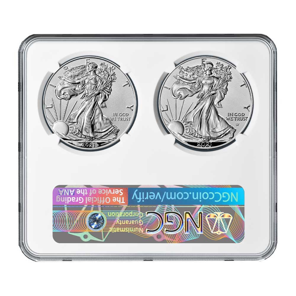 2pc Set – 2021 $1 1-oz Reverse Proof American Silver Eagle Designer NGC PF70 ER Blue Label Dual Core