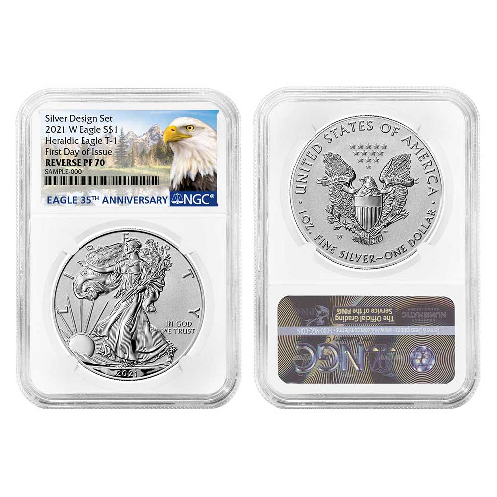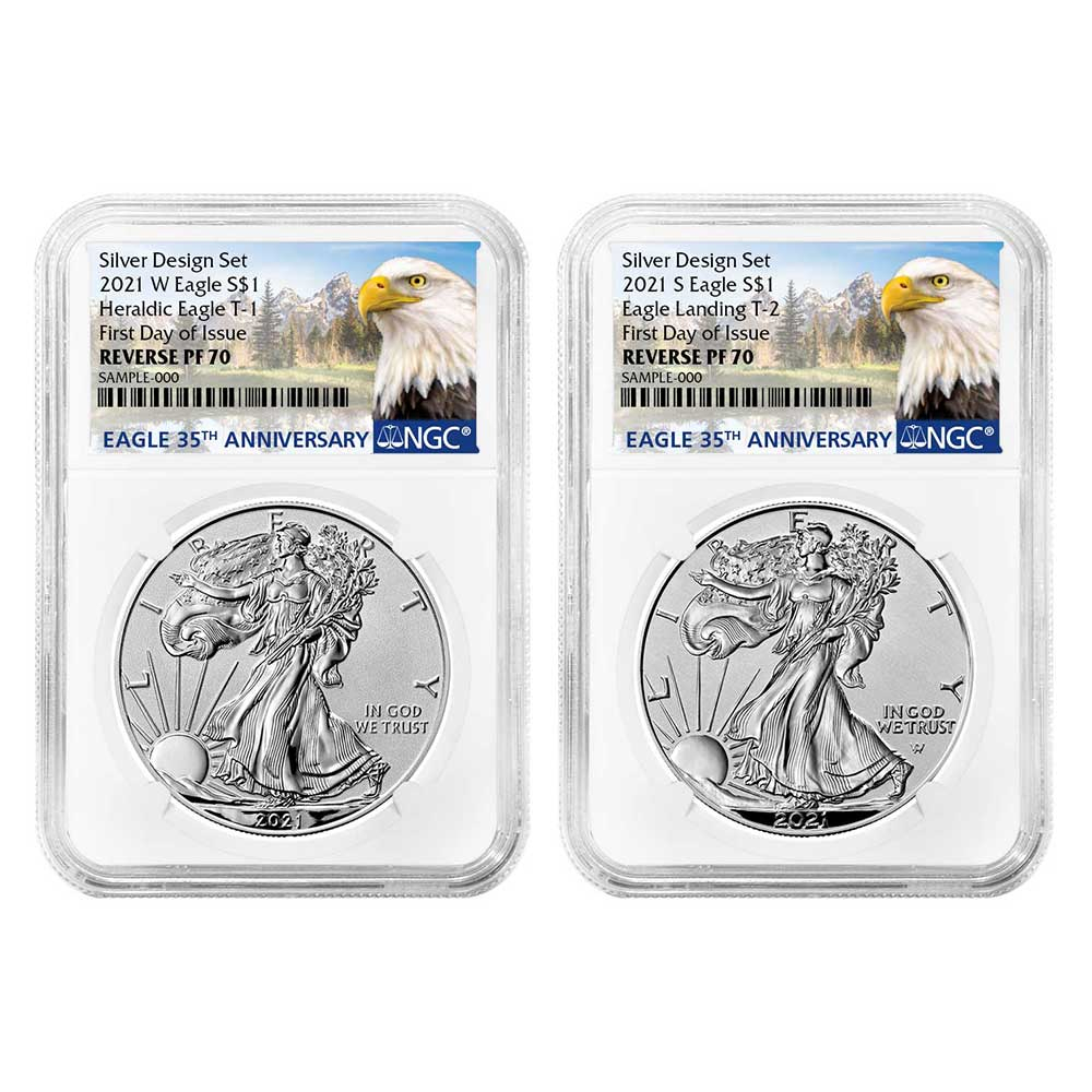 2pc Set – 2021 $1 1-oz Reverse Proof American Silver Eagle Designer NGC PF70 FDI 35th Anni. Eagle Label