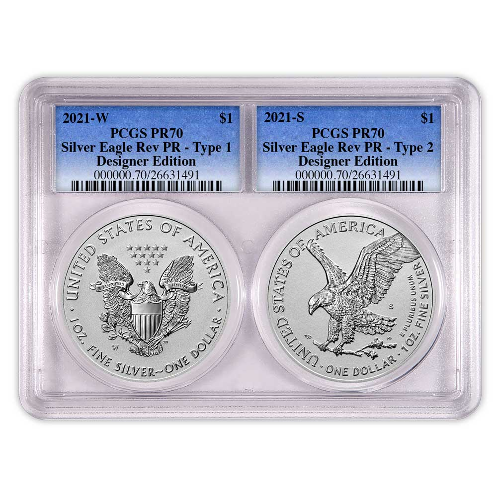 2pc Set – 2021 $1 1-oz Reverse Proof American Silver Eagle Designer PCGS PR70 Blue Label Dual Core