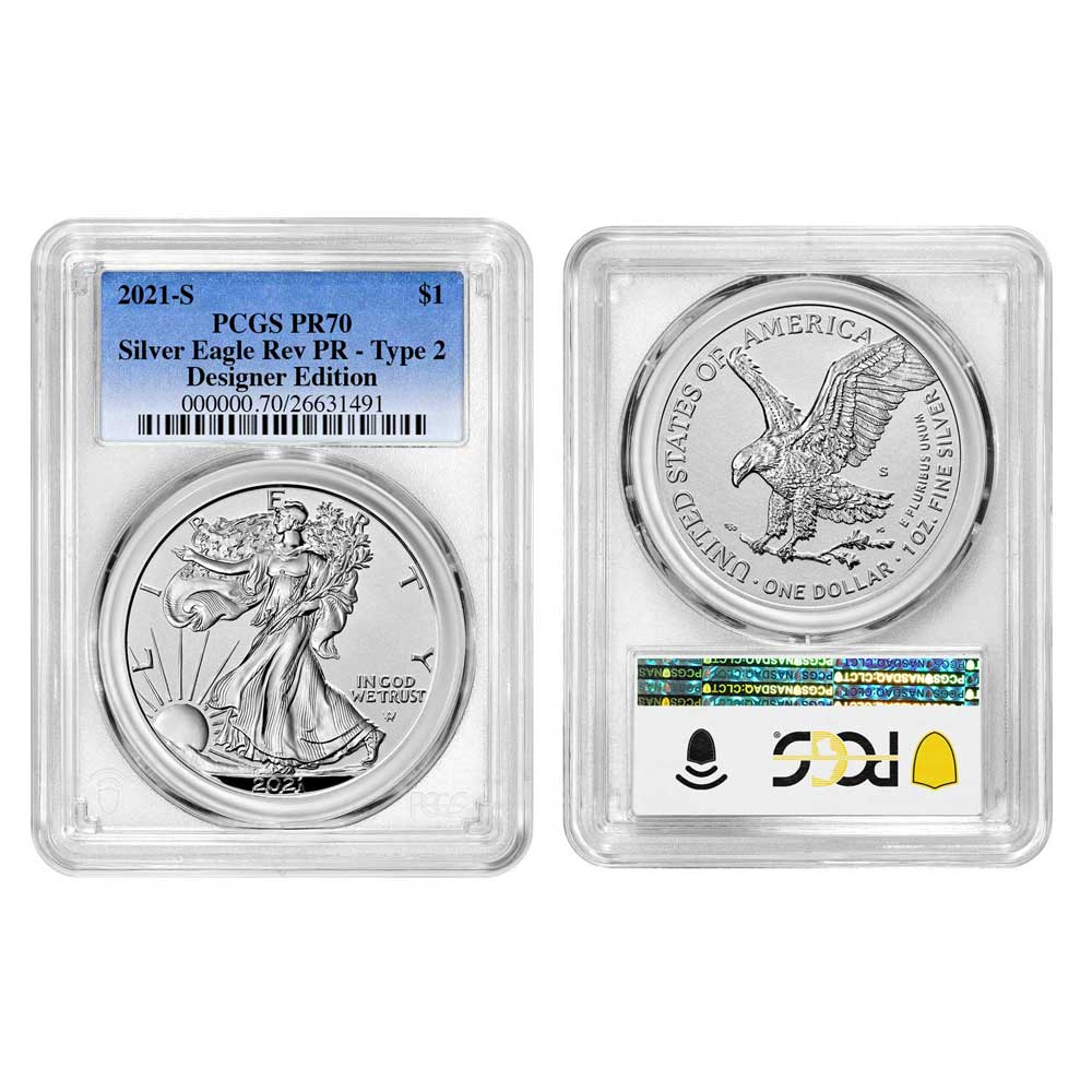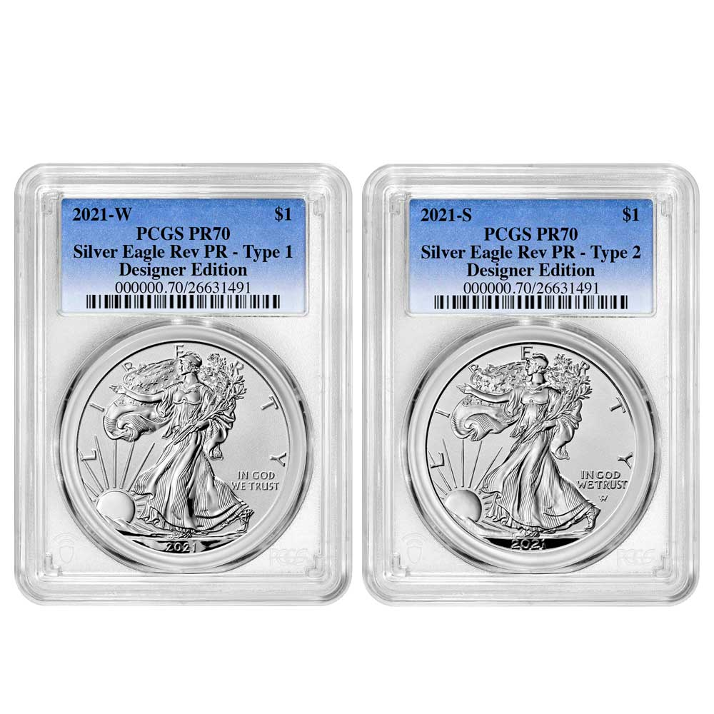 2pc Set – 2021 $1 1-oz Reverse Proof American Silver Eagle Designer PCGS PR70 Blue Label