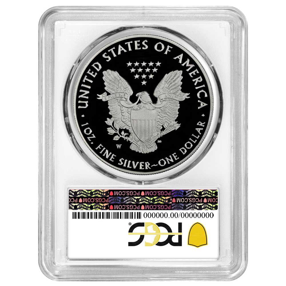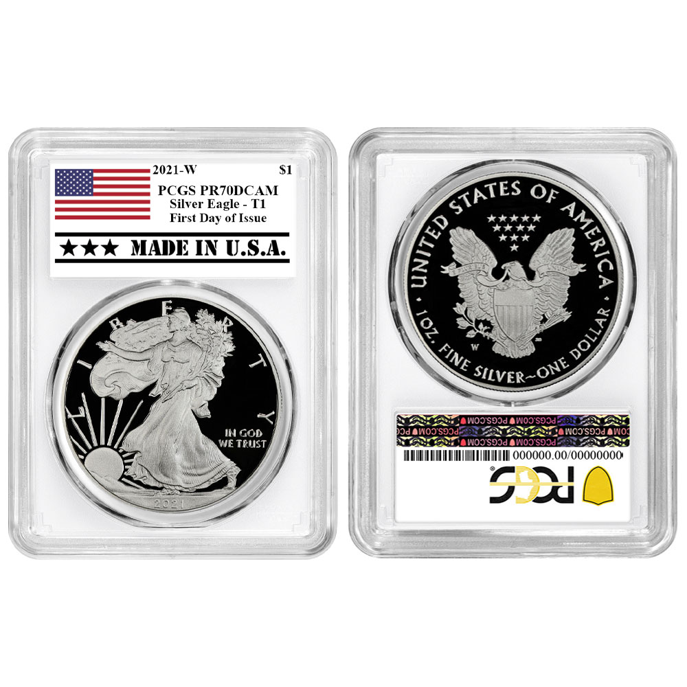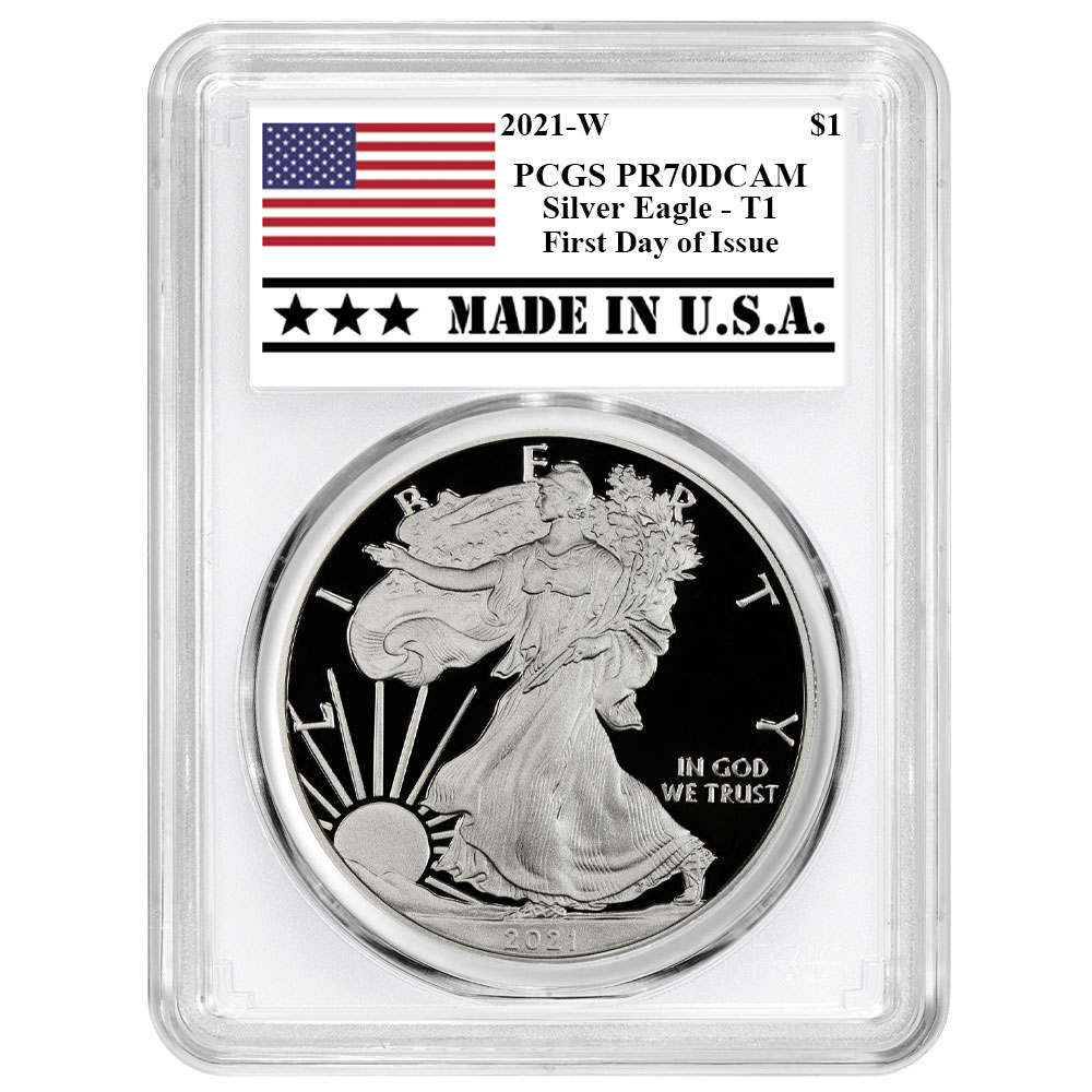 2021-W $1 1-oz T-1 Proof American Silver Eagle PCGS PR70DCAM FDOI Made in USA Label White Frame