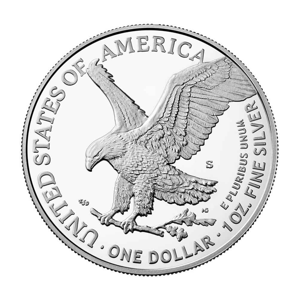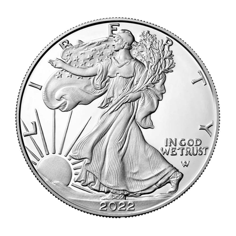 The U.S. Mint introduced a redesign in 2021. The obverse (heads side) design is based on Adolph A. Weinman’s “Walking Liberty” half dollar from 1916. Modern technology allowed for a more accurate reflection of Weinman’s original design, including the addition of his artist’s mark. The reverse (tails side) originally featured the American heraldic eagle designed by John Mercanti, the former Chief Engraver of the U.S. Mint. This design showed a bald eagle behind a shield, clutching arrows and an olive branch. The new “Eagle Landing” design depicts an eagle carrying an oak branch towards a nest. This design was created by Emily Damstra, one of the artists participating in the U.S. Mint’s Artistic Infusion Program.