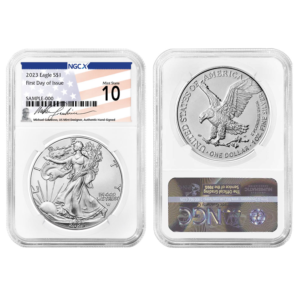 2023 $1 1-oz American Silver Eagle NGCX MS10 FDI Gaudioso Flag Label