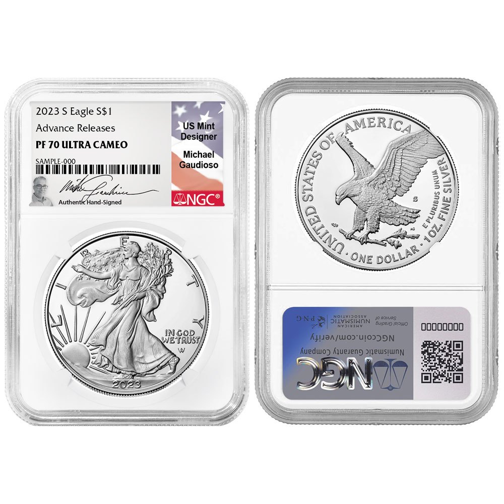 2023-S $1 1-oz Proof American Silver Eagle NGC PF70UC AR Michael Gaudioso Flag Signature label