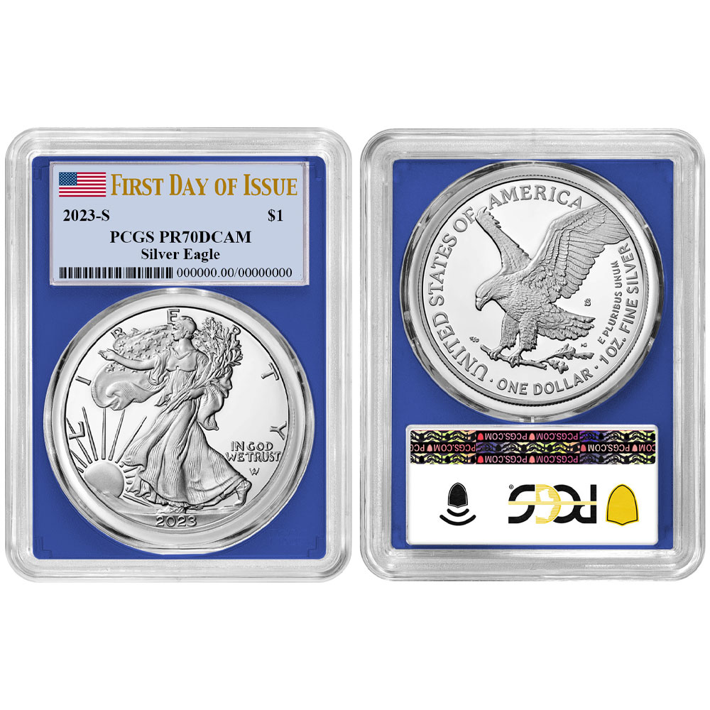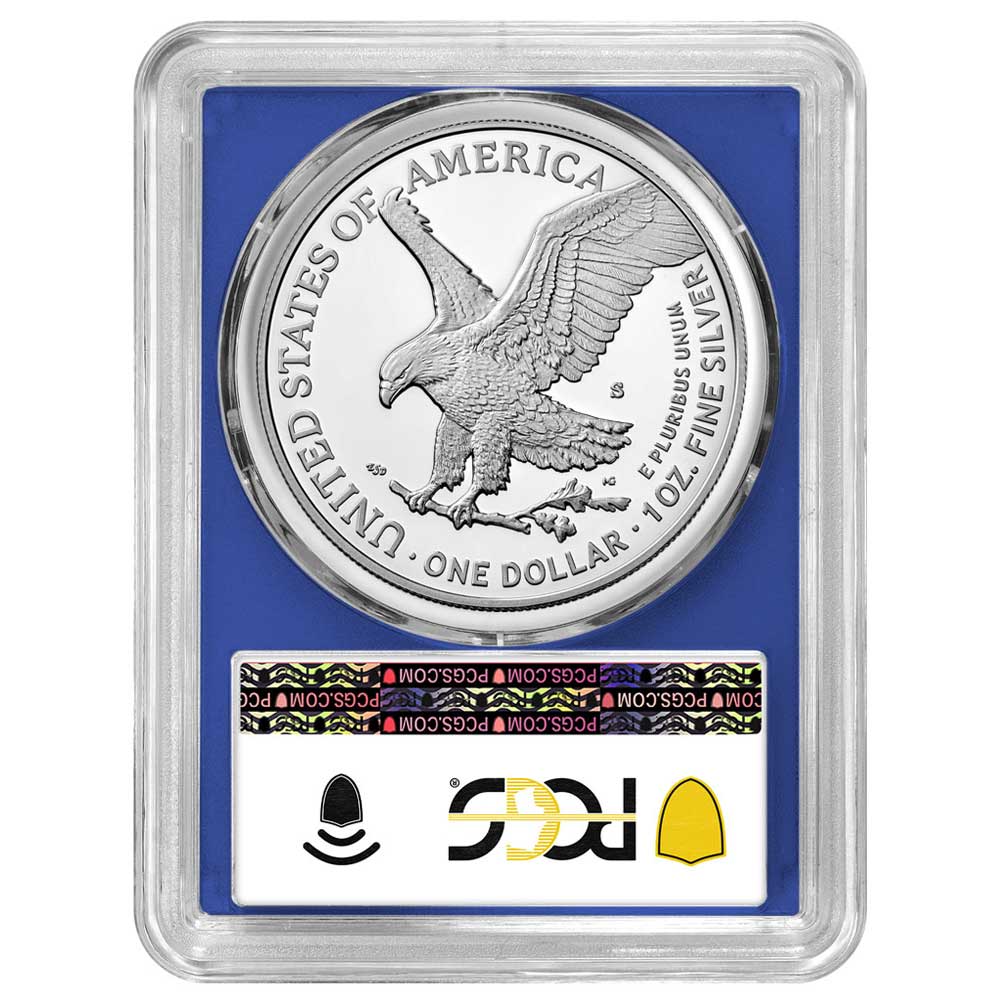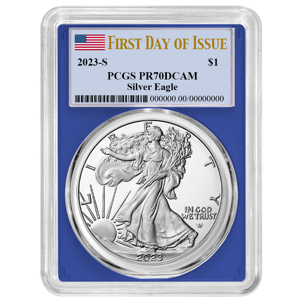 2023-S $1 1-oz Proof American Silver Eagle PCGS PR70DCAM FDOI Flag Label Blue Frame