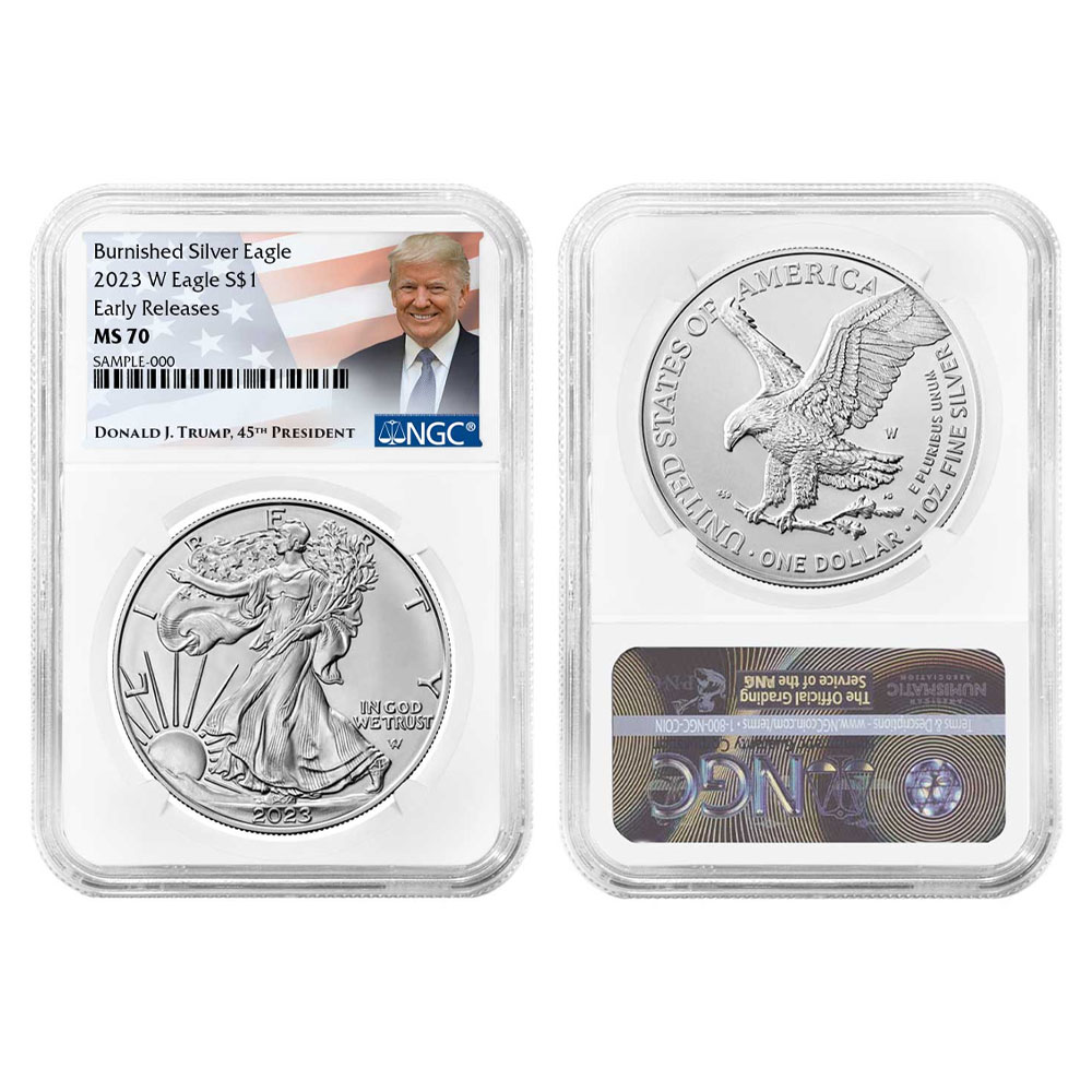 2023-W $1 1-oz Burnished American Silver Eagle NGC MS70 ER Trump Label