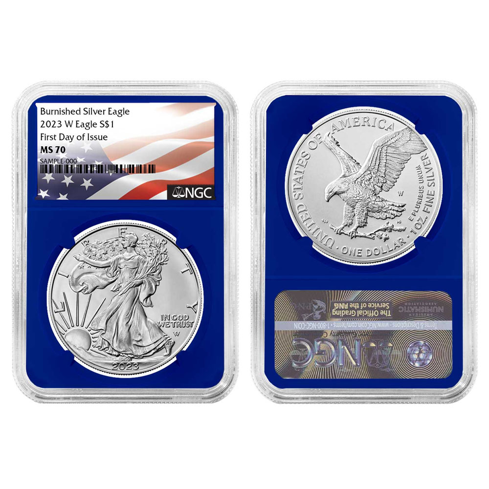 2023-W $1 1-oz Burnished American Silver Eagle NGC MS70 FDI Flag Label Blue Core