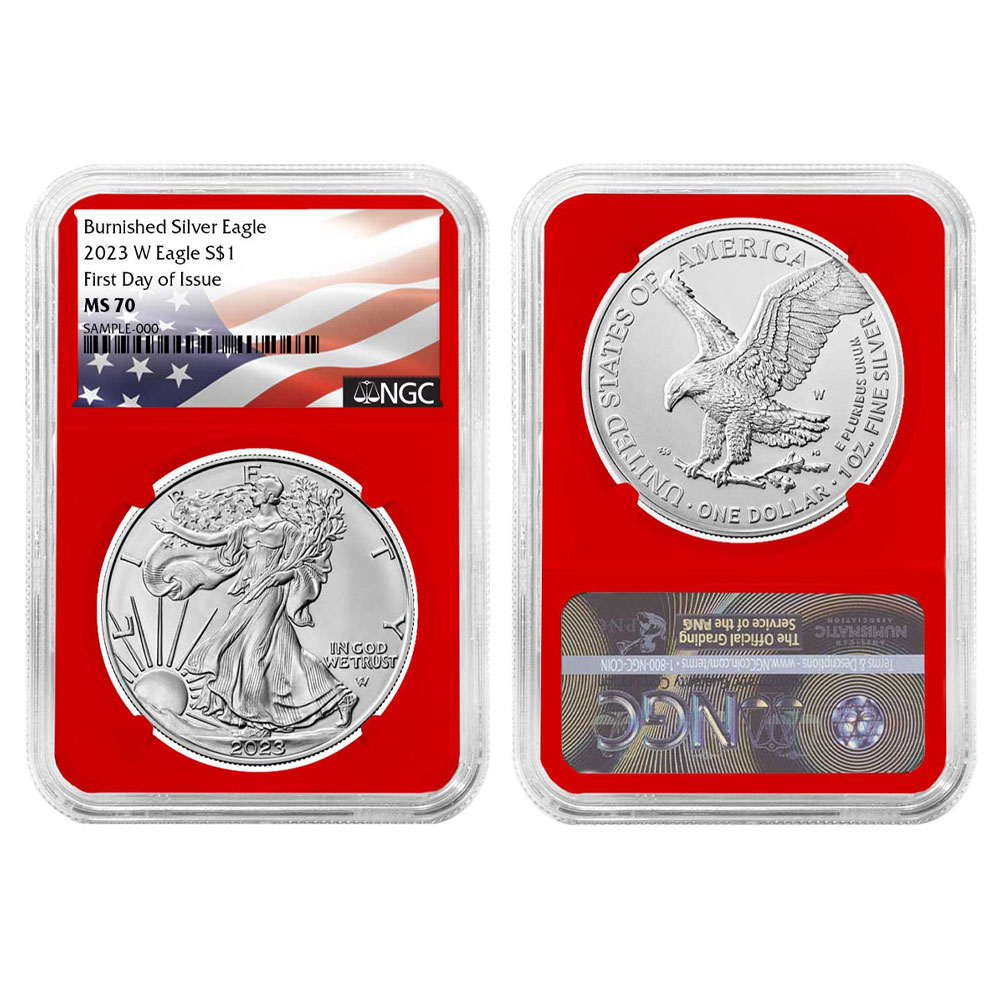 2023-W $1 1-oz Burnished American Silver Eagle NGC MS70 FDI Flag Label Red Core
