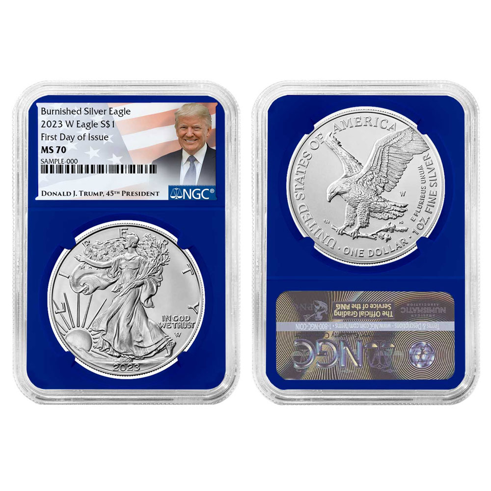 2023-W $1 1-oz Burnished American Silver Eagle NGC MS70 FDI Trump Label Blue Core