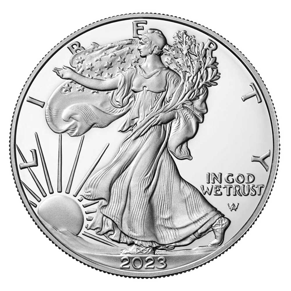 Obverse: Lady Liberty is depicted on the obverse walking towards the rising sun, while draped in an American flag. Inscribed “LIBERTY,” “2023,” “IN GOD WE TRUST” and the artist’s monogram “AW.” The image is borrowed from the iconic 1916 Walking Liberty Half Dollar designed by acclaimed medallic sculptor Adolph A. Weinman.