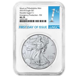 The U.S. Mint introduced a redesign in 2021. The obverse (heads side) design is based on Adolph A. Weinman’s “Walking Liberty” half dollar from 1916. Modern technology allowed for a more accurate reflection of Weinman’s original design, including the addition of his artist’s mark. The reverse (tails side) originally featured the American heraldic eagle designed by John Mercanti, the former Chief Engraver of the U.S. Mint. This design showed a bald eagle behind a shield, clutching arrows and an olive branch. The new “Eagle Landing” design depicts an eagle carrying an oak branch towards a nest. This design was created by Emily Damstra, one of the artists participating in the U.S. Mint’s Artistic Infusion Program.