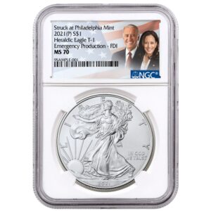 The U.S. Mint introduced a redesign in 2021. The obverse (heads side) design is based on Adolph A. Weinman’s “Walking Liberty” half dollar from 1916. Modern technology allowed for a more accurate reflection of Weinman’s original design, including the addition of his artist’s mark. The reverse (tails side) originally featured the American heraldic eagle designed by John Mercanti, the former Chief Engraver of the U.S. Mint. This design showed a bald eagle behind a shield, clutching arrows and an olive branch. The new “Eagle Landing” design depicts an eagle carrying an oak branch towards a nest. This design was created by Emily Damstra, one of the artists participating in the U.S. Mint’s Artistic Infusion Program.