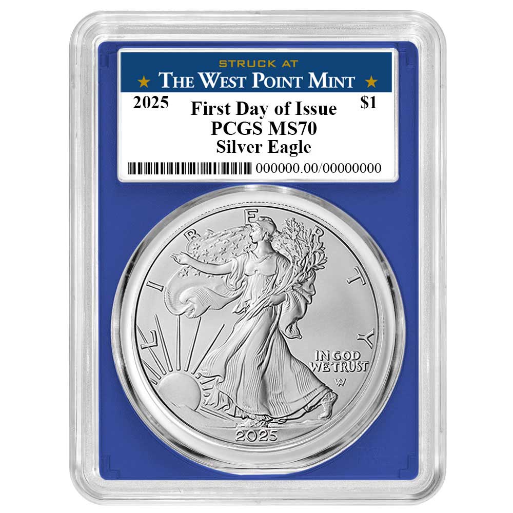 2025 $1 1-oz American Silver Eagle PCGS MS70 FDOI West Point Label Blue Frame