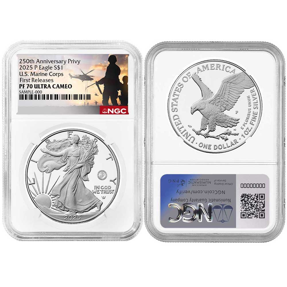 2025-P $1 1-oz Proof American Silver Eagle Marine Corps Privy NGC PF70UC FR Military Label 250th Anniversary