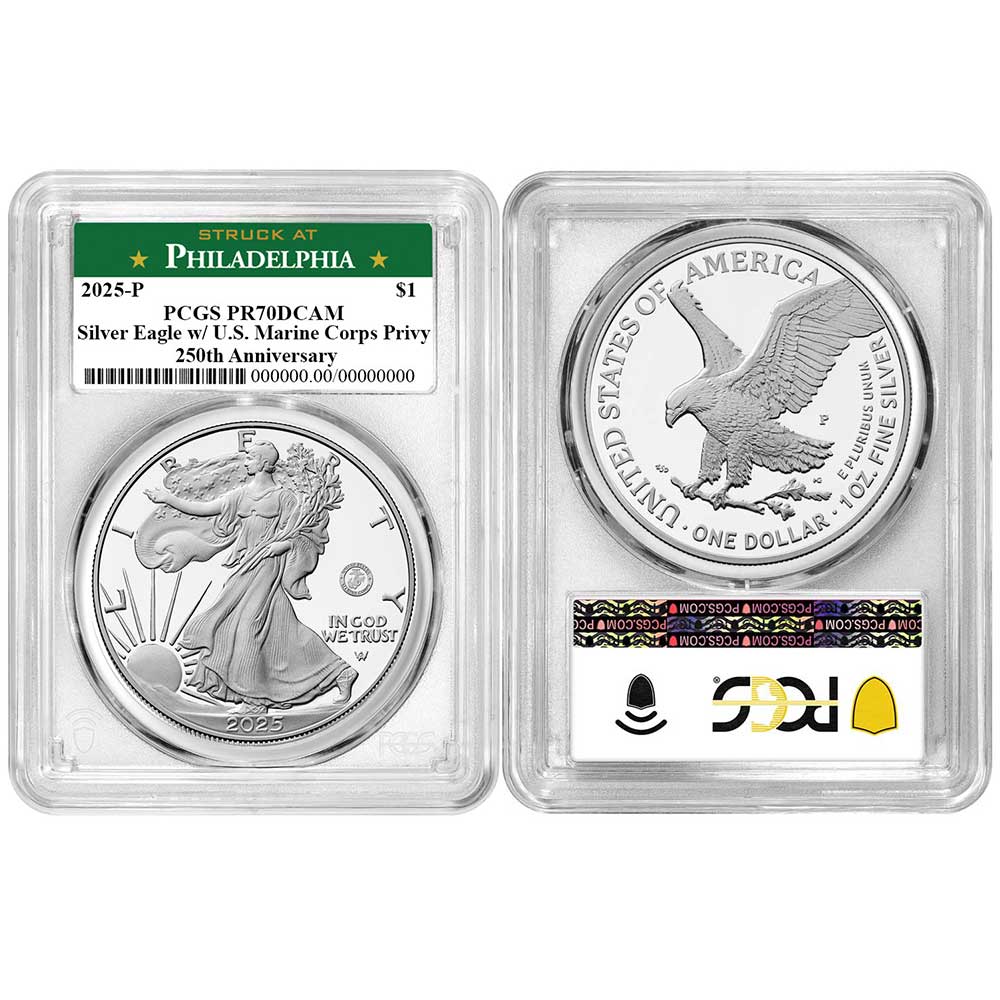 2025-P $1 1-oz Proof American Silver Eagle Marine Corps Privy PCGS PR70DCAM Philadelphia Label 250th Anniversary