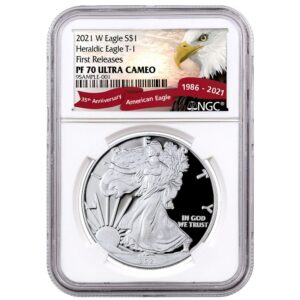 The American Silver Eagle is one of the world’s most popular silver bullion coins. Authorized by the Liberty Coin Act of 1985, these coins are made from one troy ounce of .999 fine silver and first went into production in 1986.