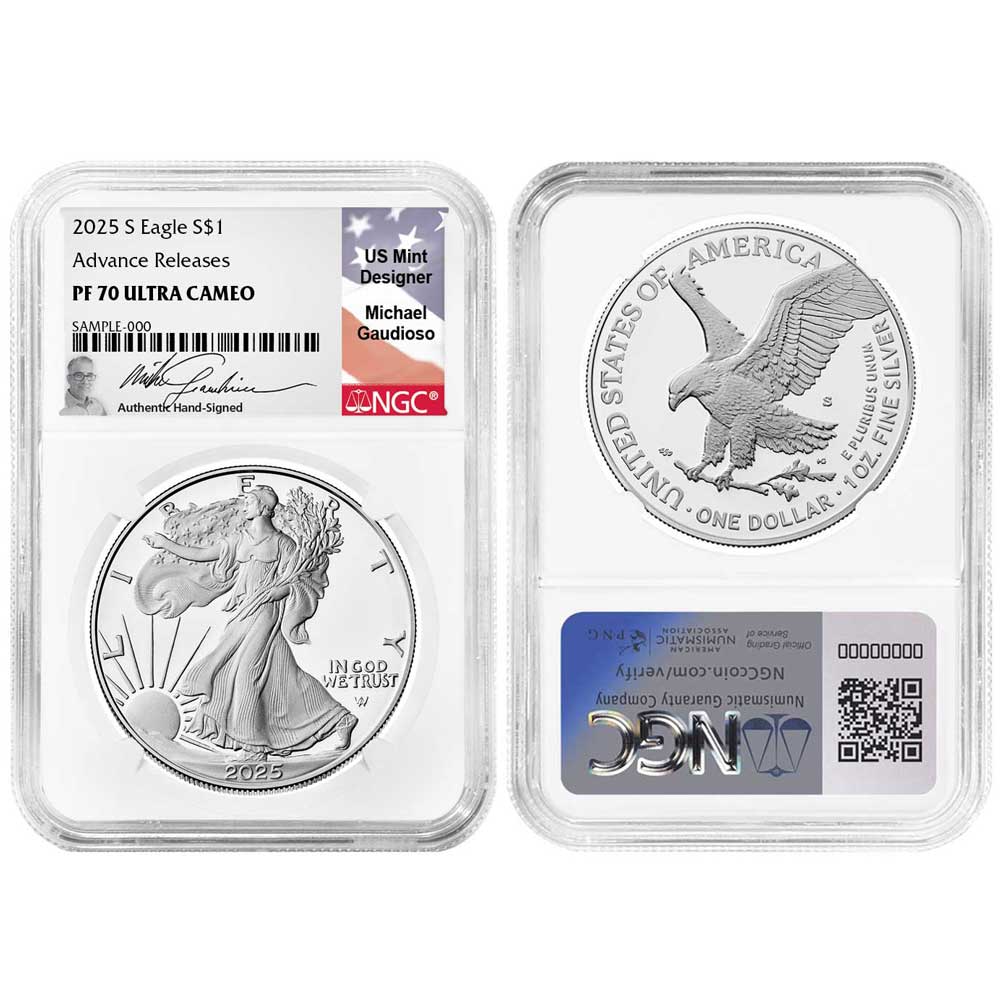 2025-S $1 1-oz Proof American Silver Eagle NGC PF70UC AR Michael Gaudioso Flag Signature Label