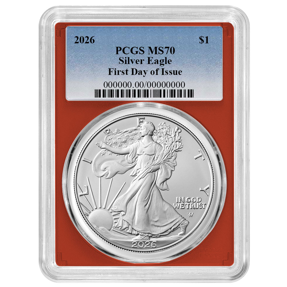 2026 $1 1-oz American Silver Eagle PCGS MS70 FDOI Blue Label Red Frame