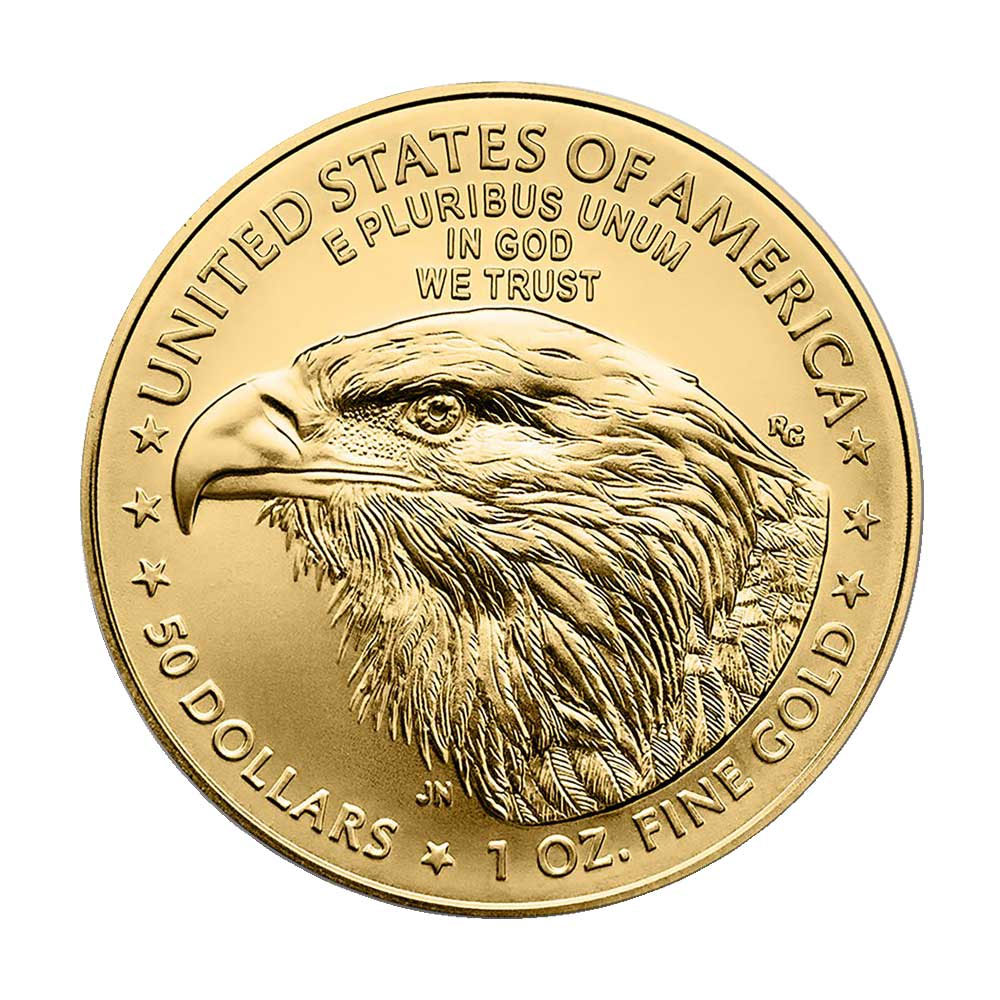 The design of the American Gold Eagle is deeply rooted in American tradition. The obverse features the iconic “Lady Liberty” designed by Augustus Saint-Gaudens. First introduced on the 1907 $20 gold coin, this powerful image of Liberty walking confidently forward is one of the most celebrated American coin designs in history. The reverse, designed by Jennie Norris and updated in 2021, depicts a left-facing profile of the majestic and powerful eagle, shown with a piercing gaze.
