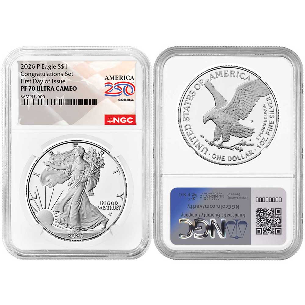 2026-P $1 1-oz Proof American Silver Eagle Congratulations Set NGC PF70UC FDI American 250th Anniversary Label