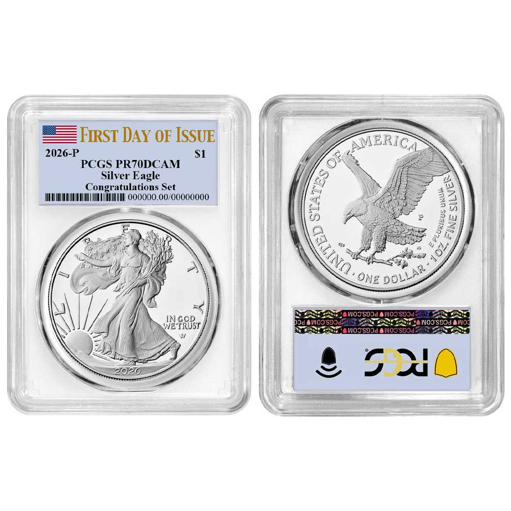 2026-P $1 1-oz Proof American Silver Eagle Congratulations Set PCGS PR70DCAM FDOI Flag Label White Frame