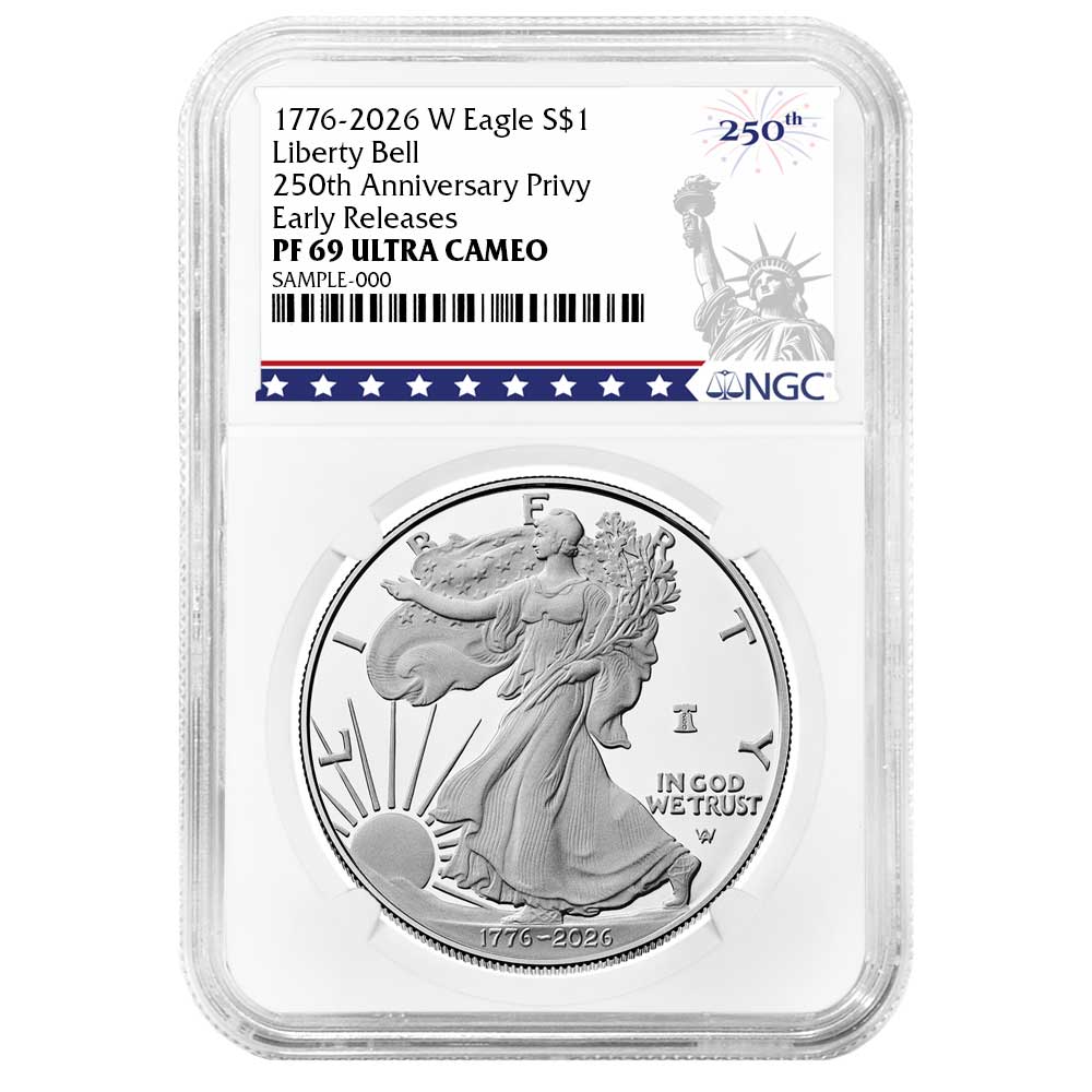 The U.S. Mint introduced a redesign in 2021. The obverse (heads side) design is based on Adolph A. Weinman’s “Walking Liberty” half dollar from 1916. Modern technology allowed for a more accurate reflection of Weinman’s original design, including the addition of his artist’s mark. The reverse (tails side) originally featured the American heraldic eagle designed by John Mercanti, the former Chief Engraver of the U.S. Mint. This design showed a bald eagle behind a shield, clutching arrows and an olive branch. The new “Eagle Landing” design depicts an eagle carrying an oak branch towards a nest. This design was created by Emily Damstra, one of the artists participating in the U.S. Mint’s Artistic Infusion Program.