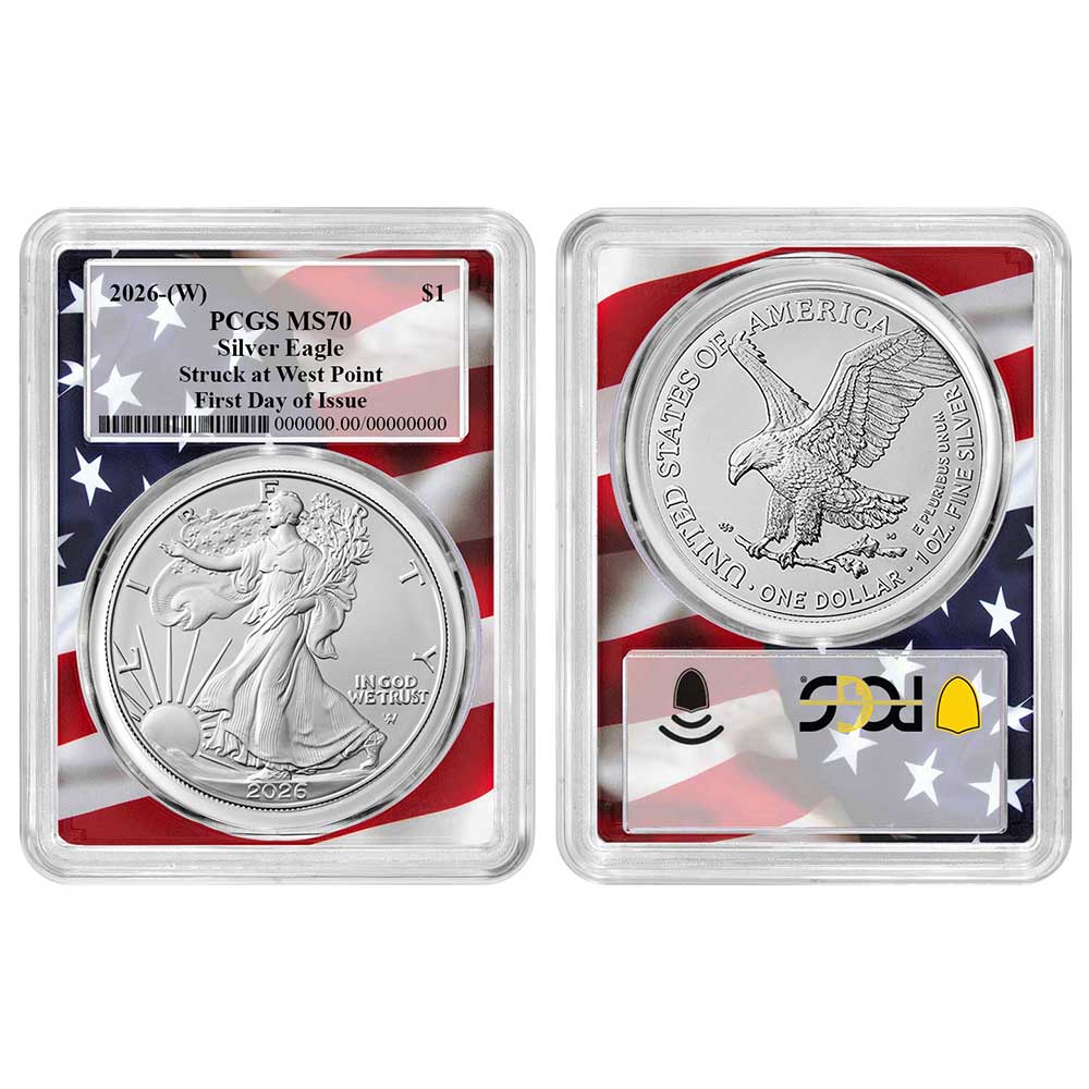 2026 (W) $1 1-oz American Silver Eagle PCGS MS70 FDOI Flag Frame