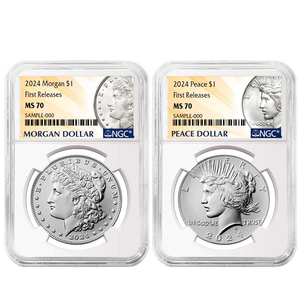 2pc Set – 2024 $1 Morgan and Peace Silver Dollar NGC MS70 FR Morgan & Peace Label