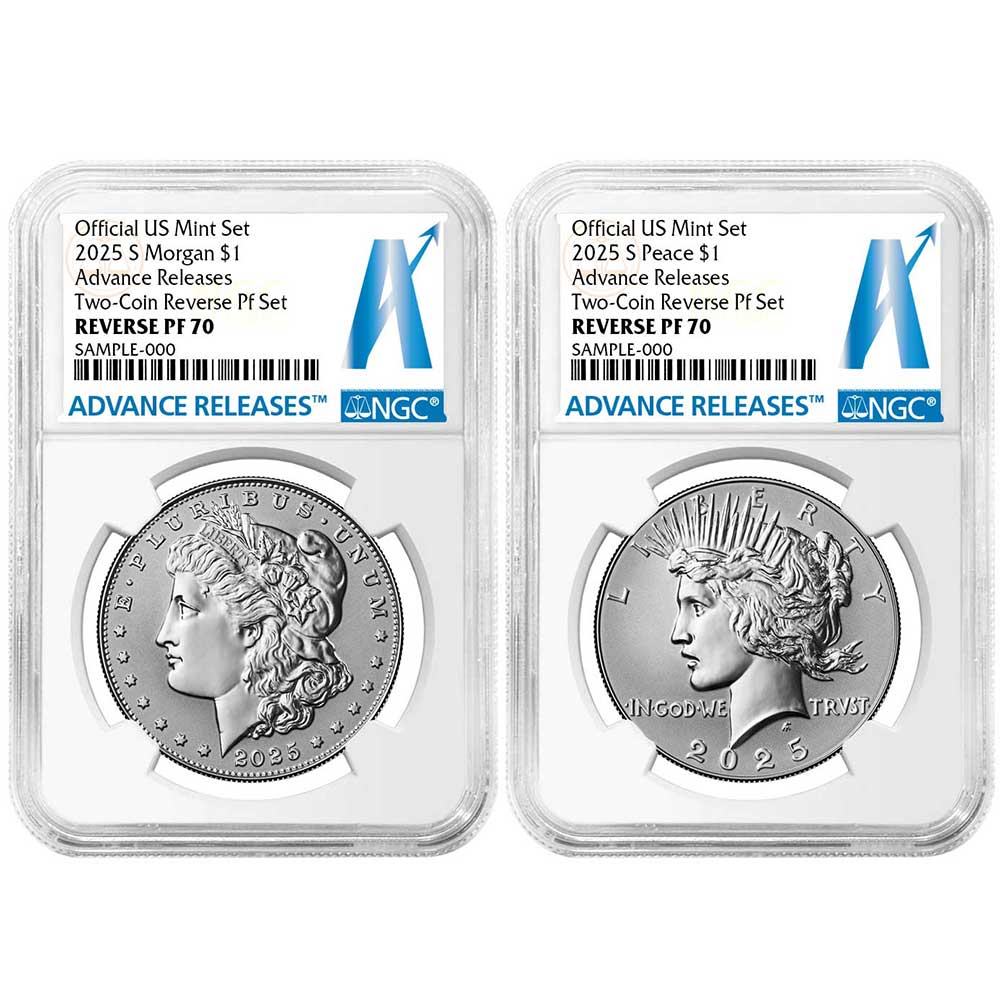 2pc Set – 2025-S Reverse Proof $1 Morgan and Peace Silver Dollar NGC PF70 AR Advance Releases Label
