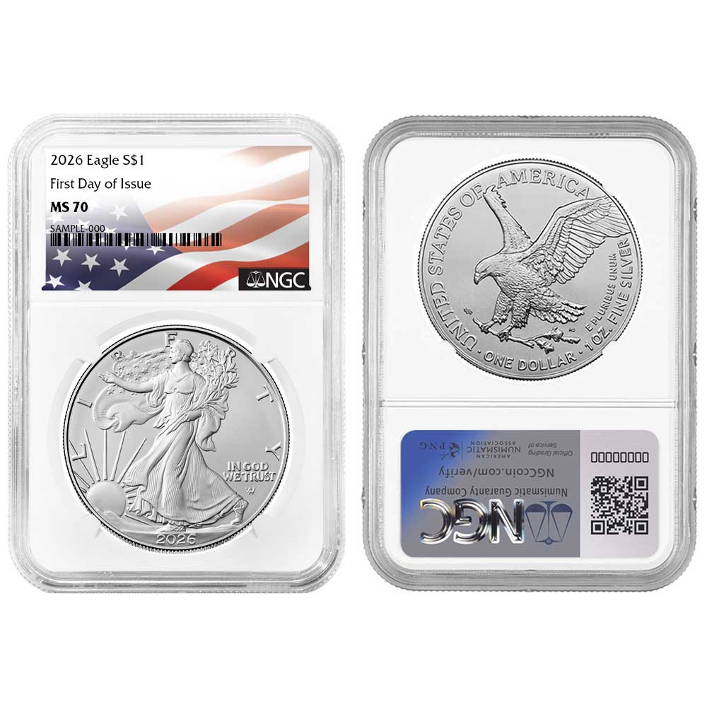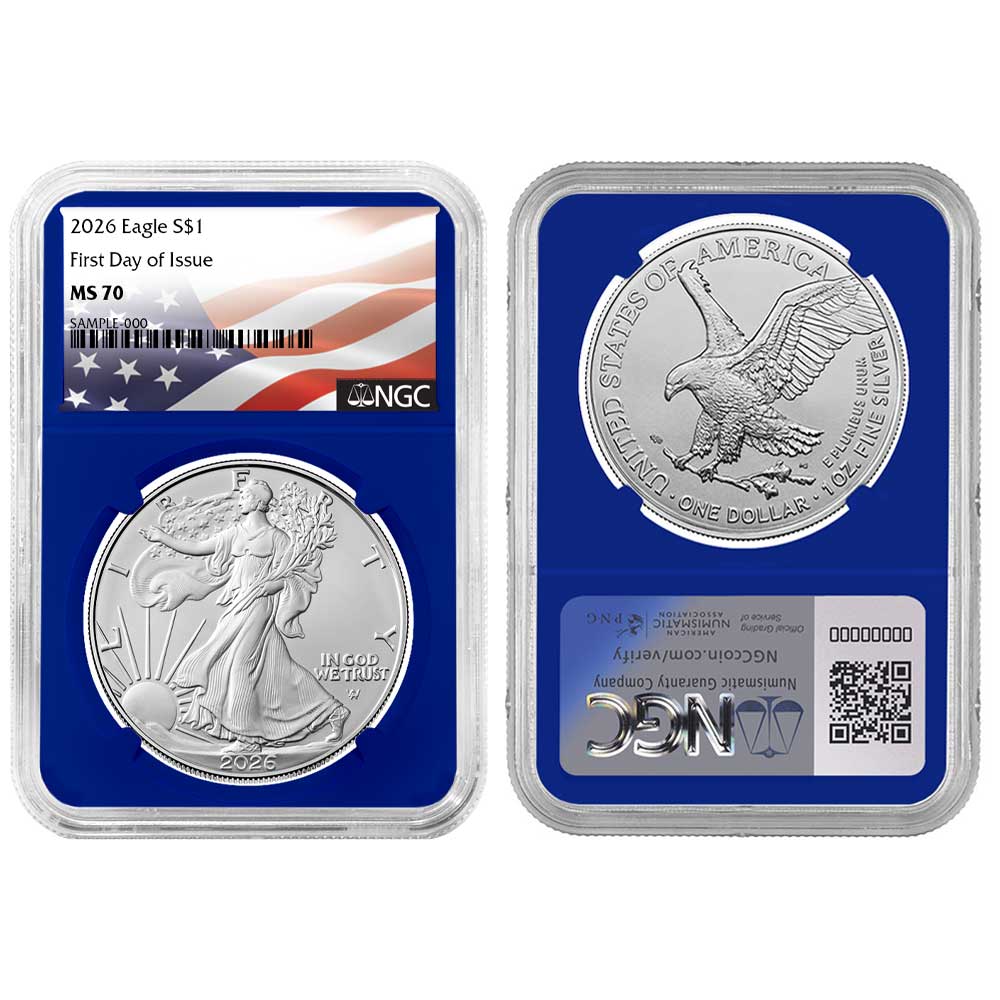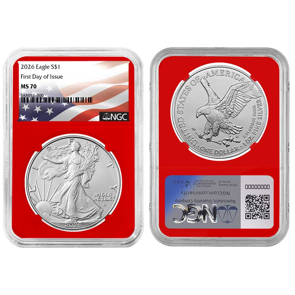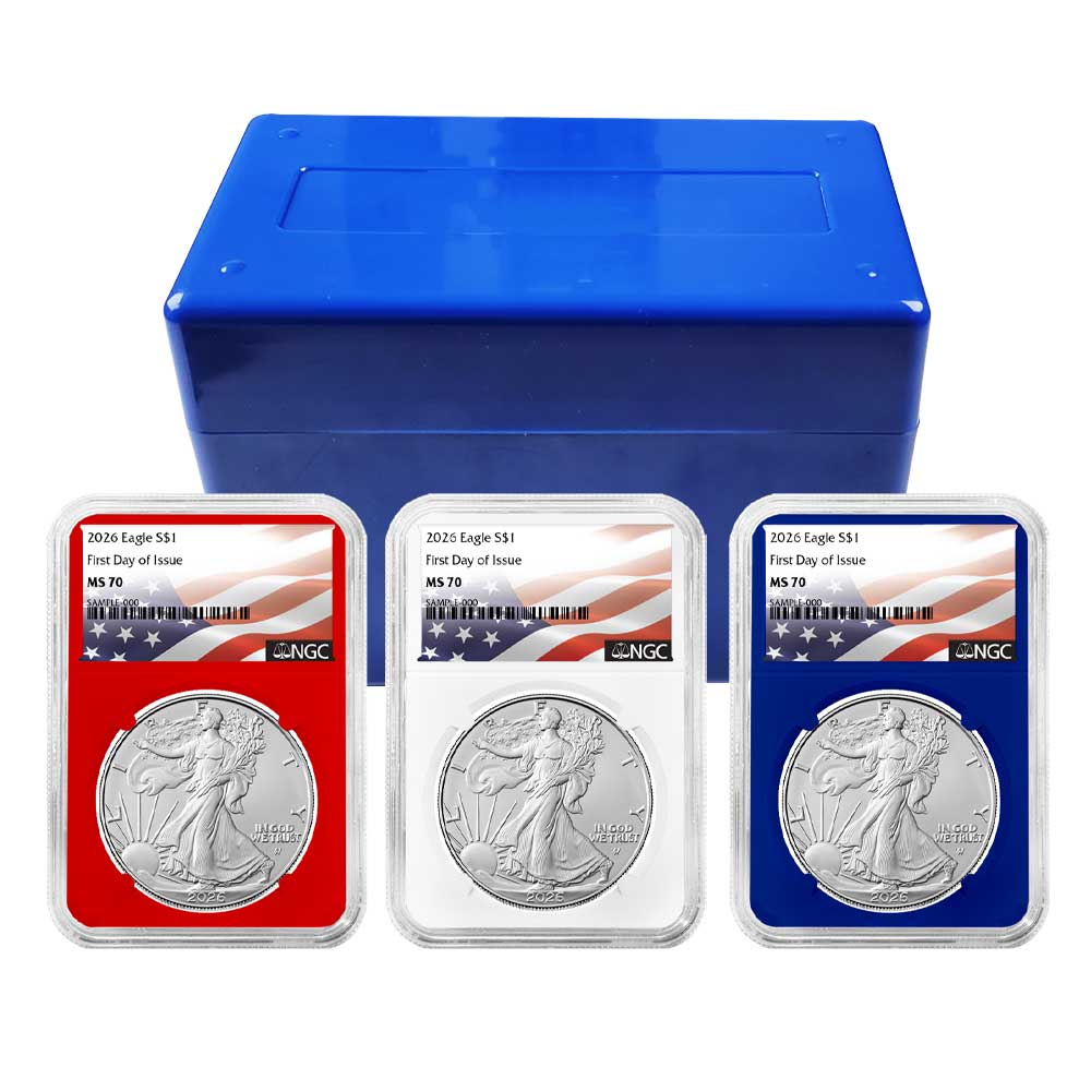 3pc Set – 2026 $1 1-oz American Silver Eagle NGC MS70 FDI Flag Label Red White Blue