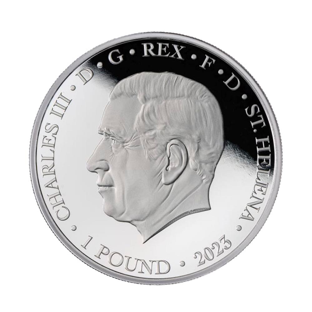 Obverse: The obverse is adorned with a portrait of His Majesty King Charles III in a left facing pose. The inscriptions “CHARLES III,” “D.G. REX F.D.,” “ST. HELENA,” “1 POUND” and “2023” encircle the effigy. This interpretation of Great Britain’s newly ascended monarch was created by renowned British artist Glyn Davies.
