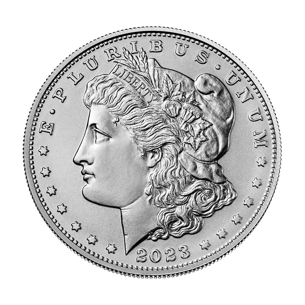 Obverse: Both faces of this coin bear the designs of the historic Morgan Dollar. Morgan made history with his selection of Anna Willess Williams, an American-style model, for Liberty rather than a Greek-style one. She faces left on the obverse wearing a Phrygian cap. Her effigy is encircled by two inscriptions, “E PLURIBUS UNUM” and “2023,” and thirteen stars.