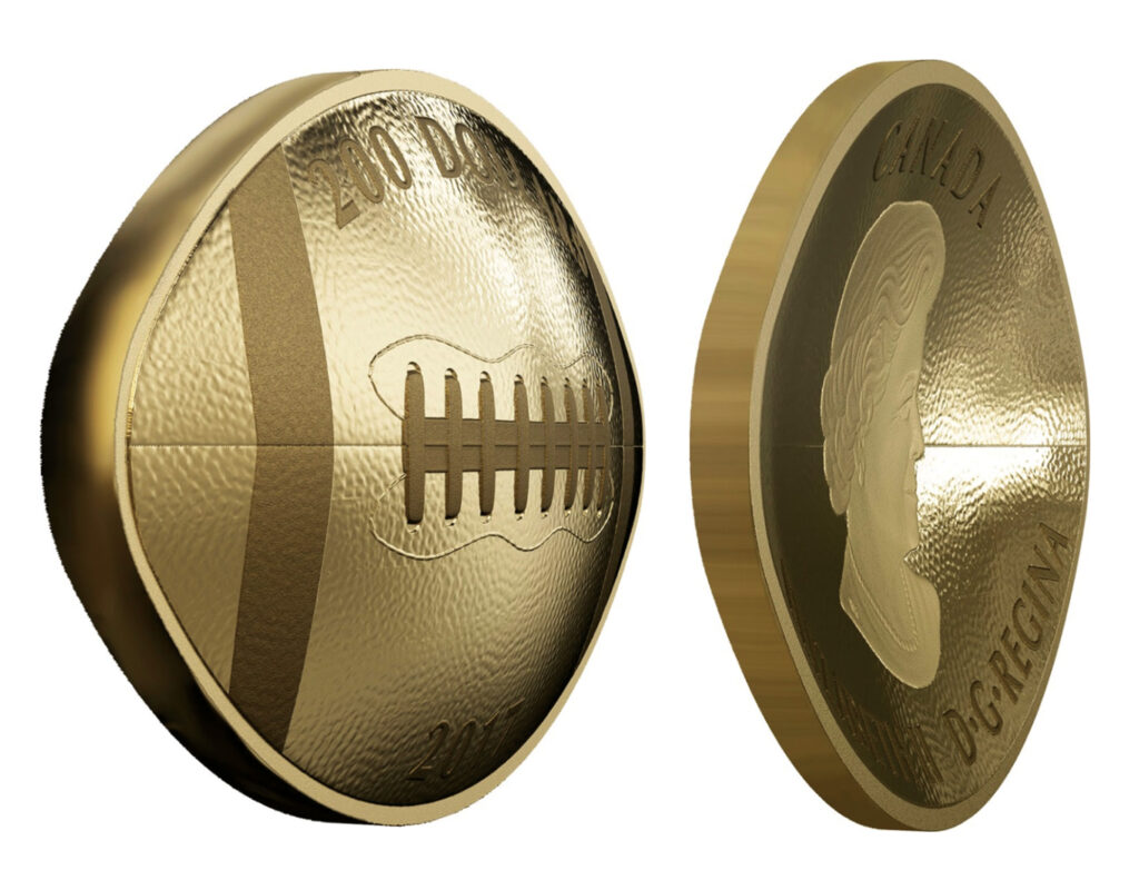 Now, the Royal Canadian Mint (RCM), in collaboration with ModernCoinMart (MCM), has issued the first-ever football-shaped silver and gold coins! These were just released by the Mint and are already available from MCM graded by the Numismatic Guaranty Corporation (NGC) and in original Mint packaging. Like baseball coins, they are concave on the obverse and convex on the reverse side, but they are elongated to an oval shape that resembles a football.